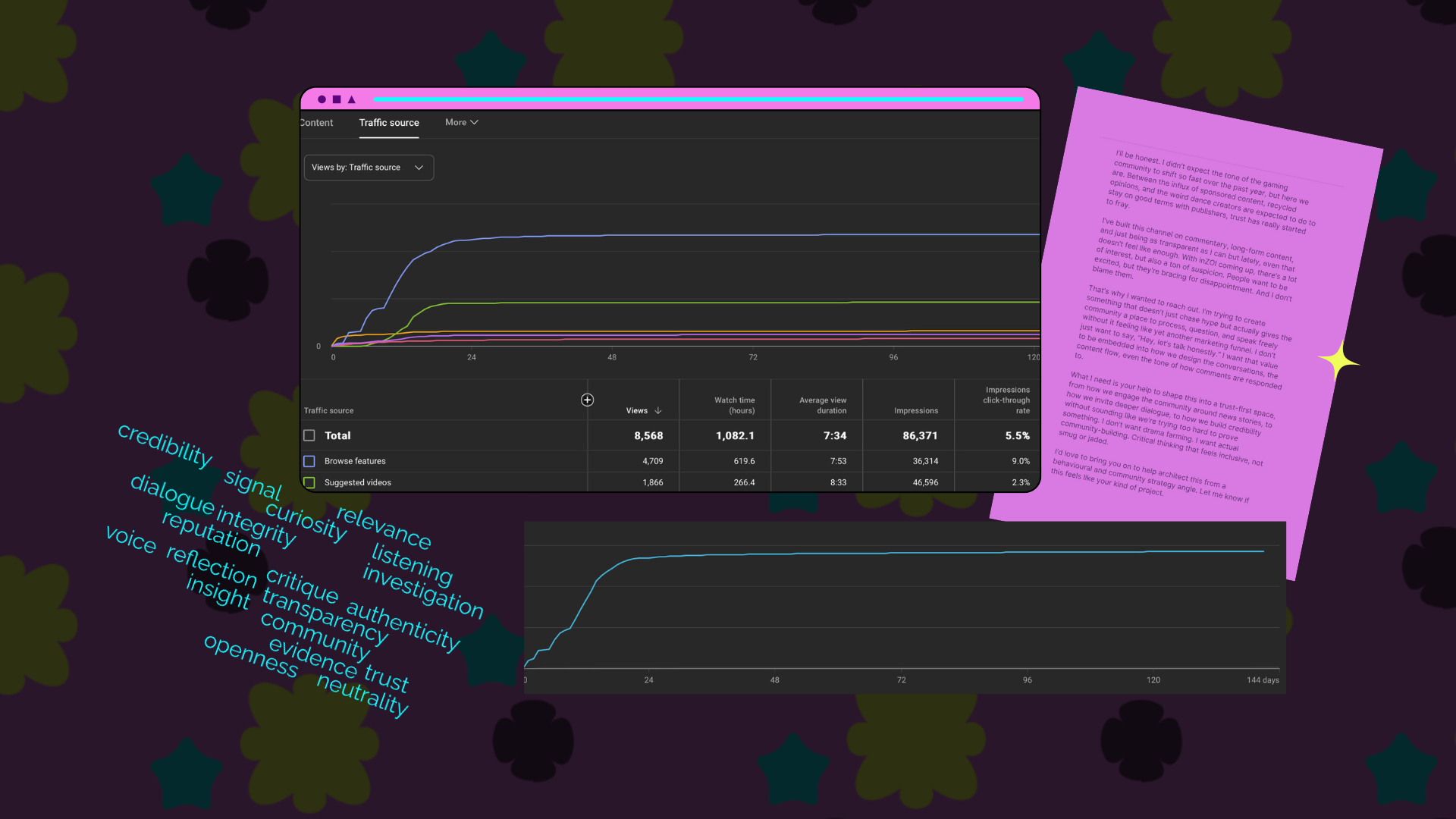 Gained 8,568 organic views and over 1,082 watch hours, largely from browse features and suggested videos, reflecting strong topic relevance